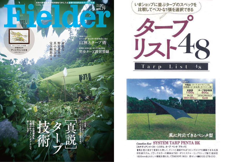 アウトドア雑誌「Fielder」vol.79『秋の、マストバイ。』の「[真説]タープ技術・タープリスト48」特集にて、カナディアンイースト×Ogawa(オガワ)コラボ「System Tarp Penta BLACK」をご紹介いただきました。